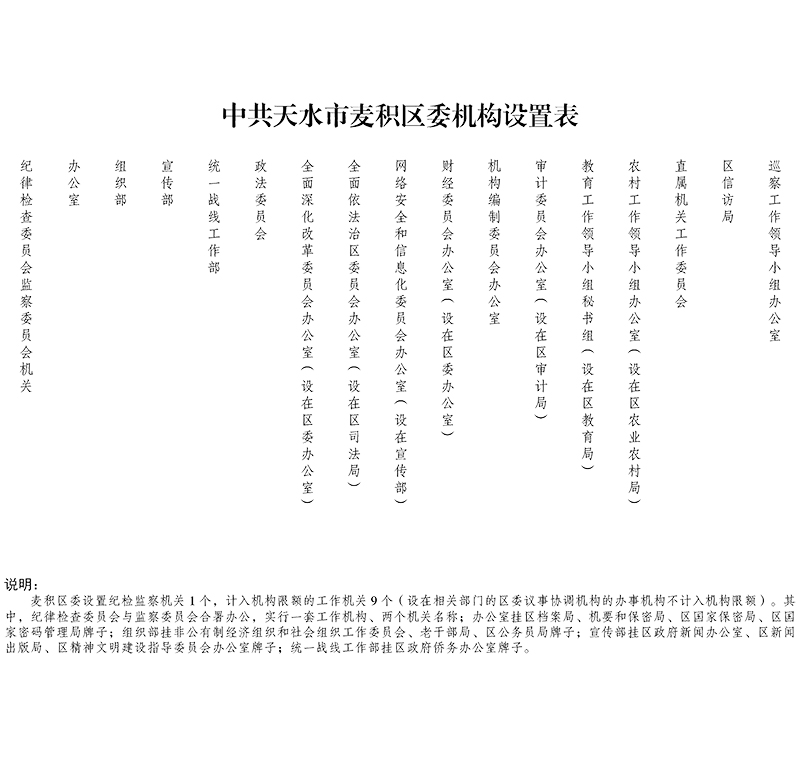区委办公室、区委直属机关工作委员会、区信访局、区委巡察工作领导小组办公室作为区委工作机关;区发展和改革局、区教育局、区工业和信息化局、区民政局、区财政局、区人力资源和社会保障局、区住房和城乡建设局、区交通运输局、区水务局、区商务局、区统计局作为区政府工作部门。其中: