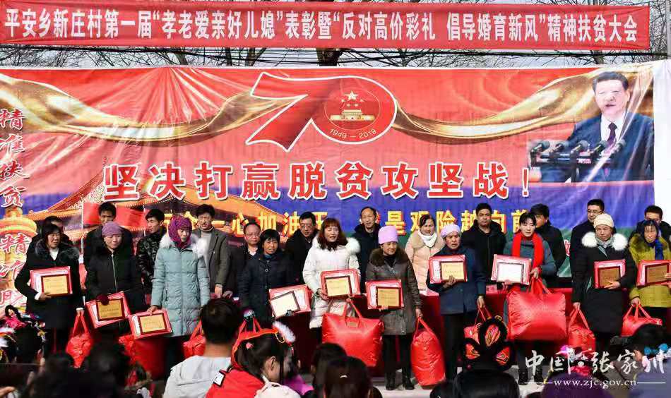 在2020年1月17日(农历腊月23)借助新庄村堡子组春节期间文化活动现场,召开表彰大会,颁发奖牌和荣誉证书,对获奖人员进行了表彰。帮扶单位县委编办,平安乡党委、政府班子成员出席了颁奖大会,进行了指导和工作总结。