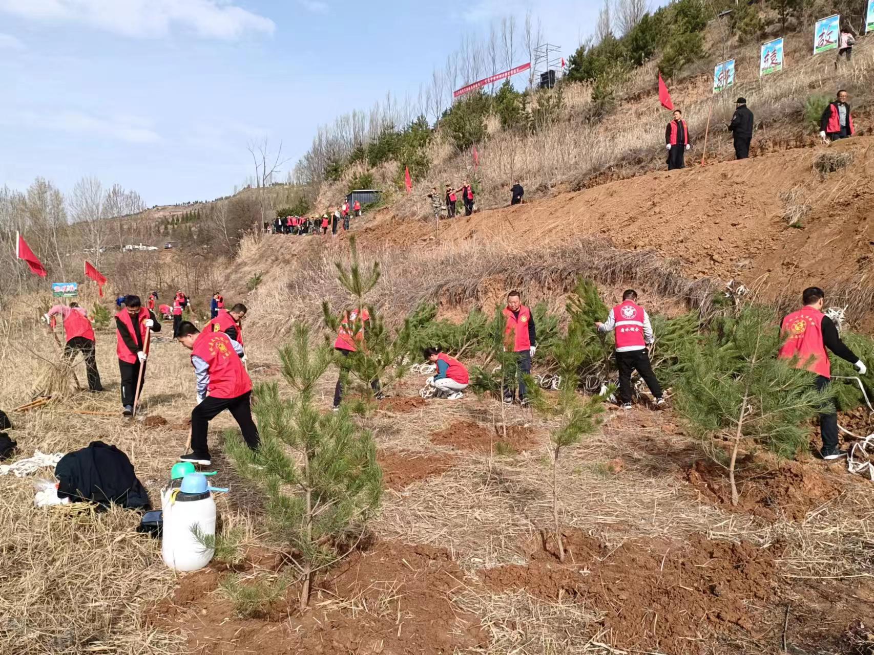植树现场,红旗飘扬大家纷纷撸起袖子、甩开膀子,两三人一组,挥锹翻土、扶苗栽植、培土固根、浇水灌溉,严格按照一按、二踩、三埋实的栽植技术要求,认真种下每一颗树苗。在全体干部的团结合作下,50余株油松树苗植入肥沃的土壤为“轩辕故里·康养福地”再添新绿。